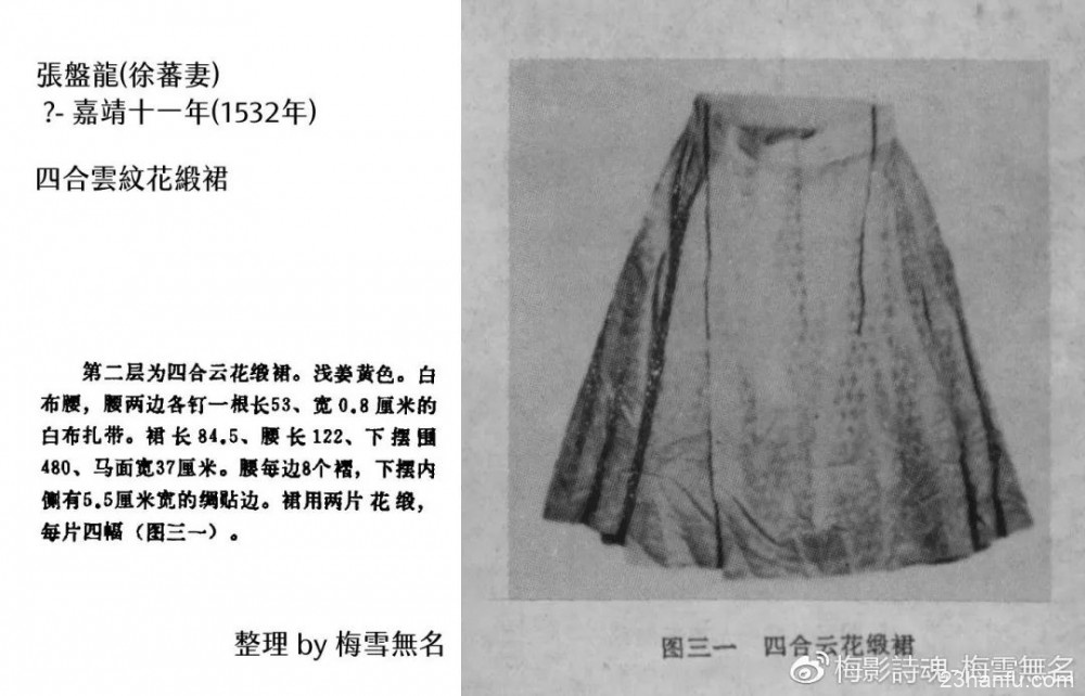 一般常见的裙子是用四幅拼成的。像是张盘龙这件就很明白的写了,每片四幅,下摆围480公分。下摆四百多公分是明代马面常见的数据,所以一般会建议做四米䙓的裙子。