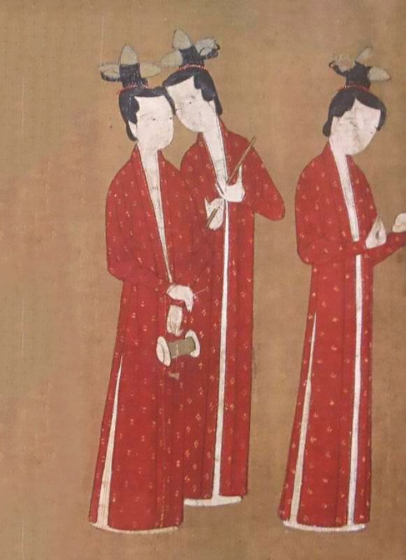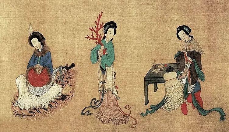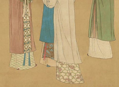 《簪花仕女图》中几位贵人穿的正是诃子裙。孟浩然有两句诗:“坐时衣带萦纤草,行即裙裾扫落梅。”她们的裙摆长到拖地,都可以用来拖扫地面的梅花。